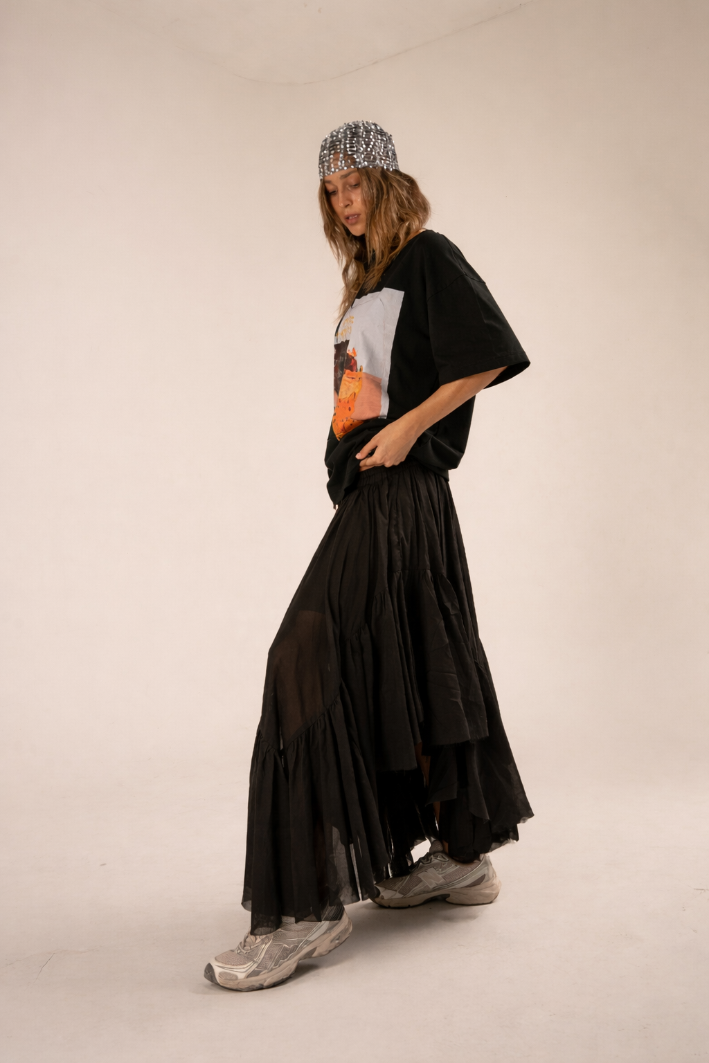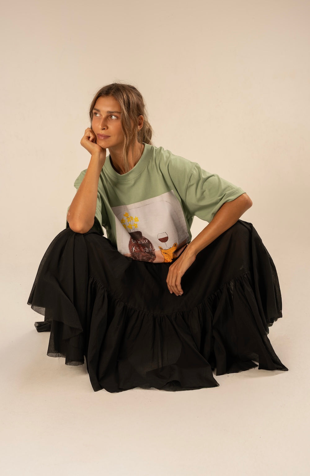 This shirt is crafted from soft breathable cotton and features an exclusive print by Indonesian multidisciplinary artist Riz. His playful mix of feminine figures, animals and poetic symbols brings a dreamy yet powerful energy to the piece, turning everyday wear into a small wearable artwork made to feel both personal and alive.